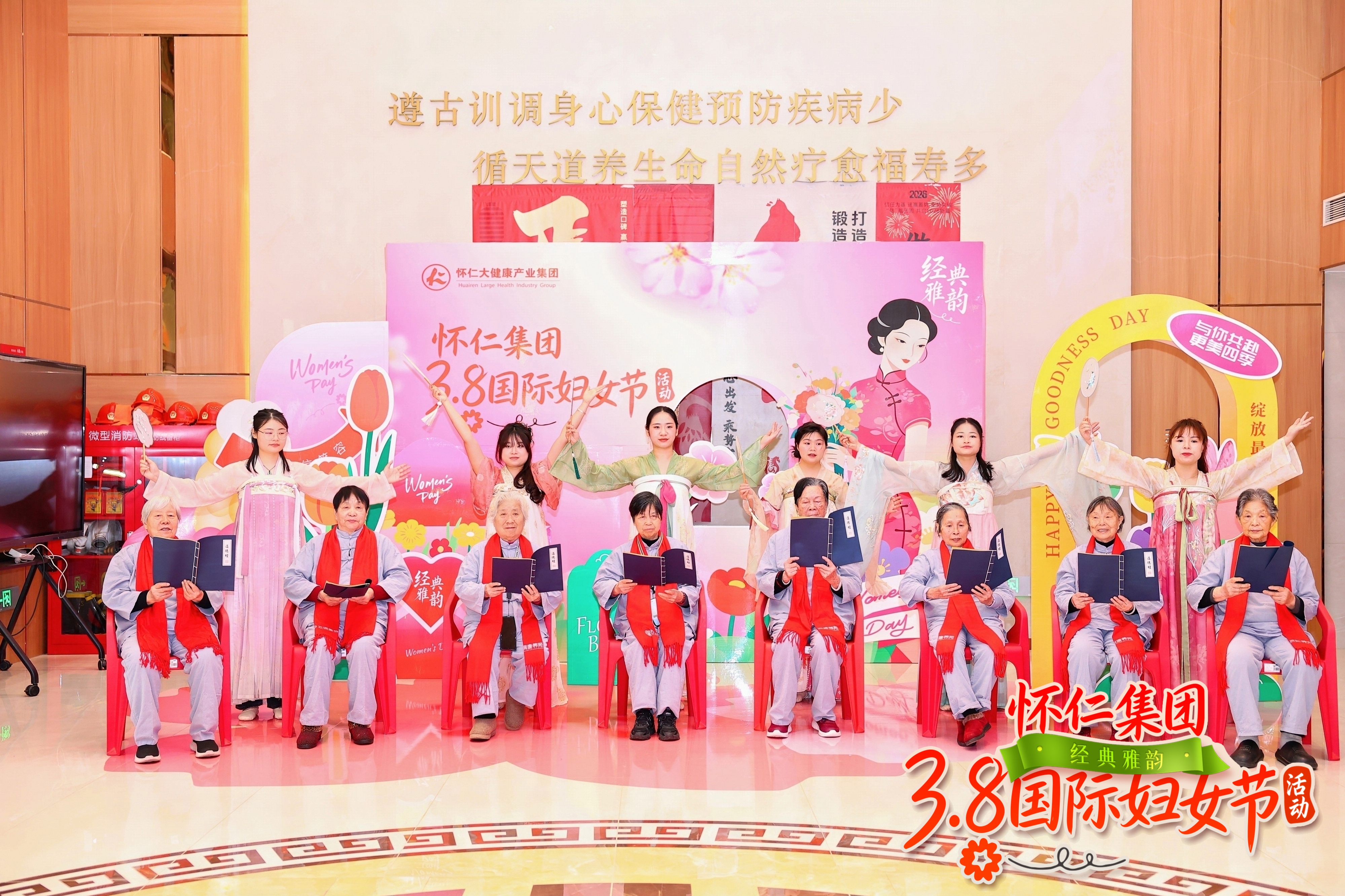 隨后,一場(chǎng)別開生面的文化展演將現(xiàn)場(chǎng)氣氛推向第一個(gè)高潮。來自懷仁集團(tuán)的員工代表與康養(yǎng)苑入住的多位女性長(zhǎng)者聯(lián)袂登臺(tái),共同表演了節(jié)目《傳承經(jīng)典 共守初心》。她們齊聲誦讀《道德經(jīng)》選段,聲音沉穩(wěn)而富有韻律,白發(fā)與青絲交相輝映,不僅展現(xiàn)了中華經(jīng)典文化的深邃魅力,更傳遞出不同年齡段女性對(duì)初心與智慧的共同堅(jiān)守,贏得了在場(chǎng)觀眾的陣陣掌聲。